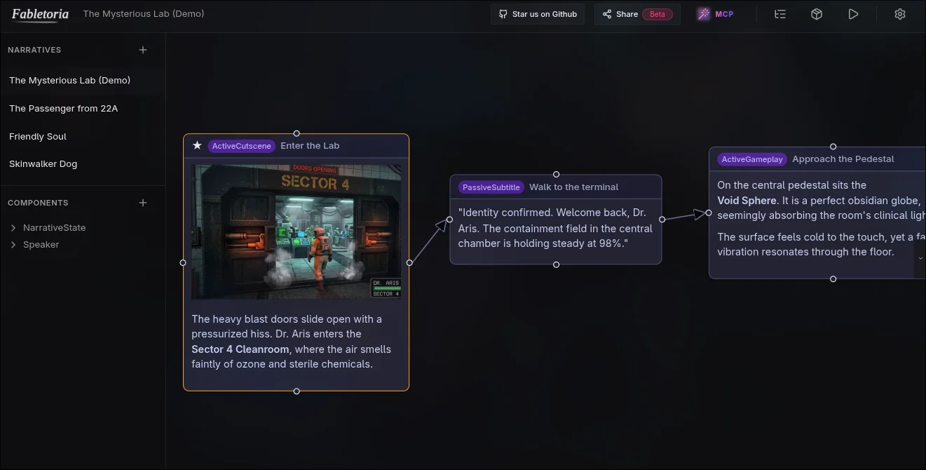 Fabletoria is a free, open-source narrative design tool. Design branching narratives on a visual canvas, then play them instantly in the same tool. No export step, no account, no cost. Ever.